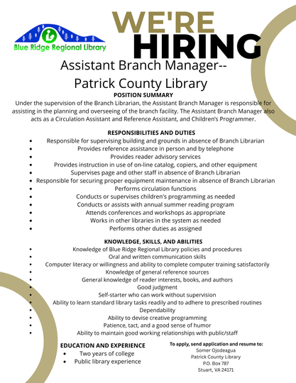 Seeking Employment Opportunities: Interested parties should apply on the school division's website: www.patrick.k12.va.us. For more information, contact Amanda Holt at (276) 694-3163 or amanda.holt.@patrick.k12.va.us